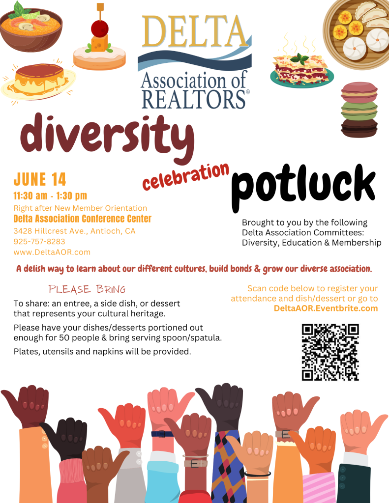 You are invited to celebrate Pride & Diversity Month with a Potluck Mixer. We will be showcasing delicious dishes from individual’s heritage. You can sign up to share a traditional or favorite dish, appetizer or dessert, or attend and learn more about different cultures and backgrounds that our wonderful Delta Association membership is made up of.
