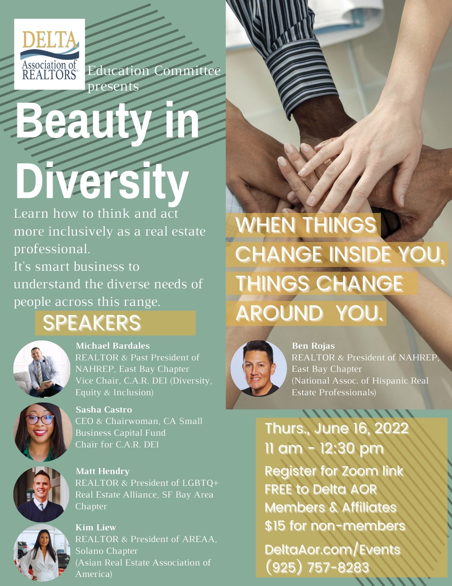 Delta Association of REALTORS Education Committee presents “Beauty in Diversity Panel” via Zoom. Learn how to think and act more inclusively as a real estate professional. It’s smart business to understand the diverse needs of people across this range. “When things change inside you, things change around you.”