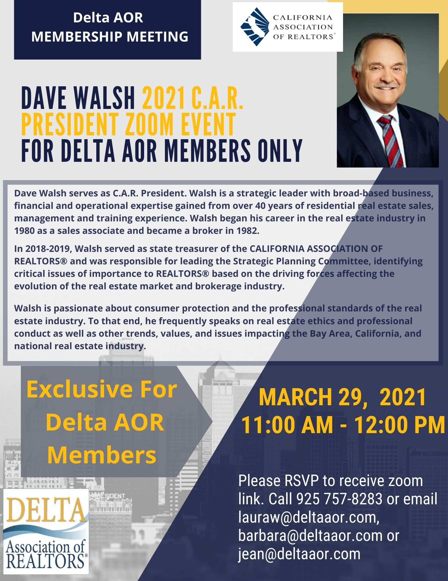 Dave Walsh 2021 C.A.R. President – Zoom Event for Delta AOR Members ONLY