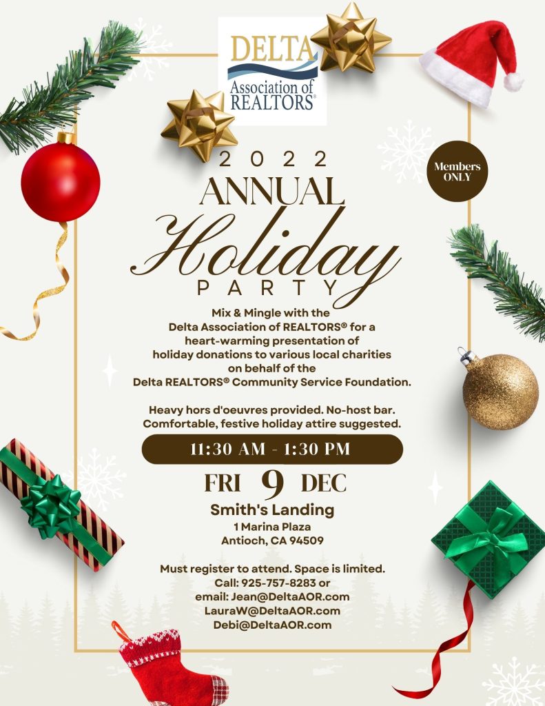 Mix & Mingle with the Delta Association of REALTORS® for a heart-warming presentation of holiday donations to various local charities on behalf of the Delta REALTORS® Community Service Foundation on Friday., Dec. 9th from 11:30 to 1:30 pm at Smith’s Landing in Antioch.