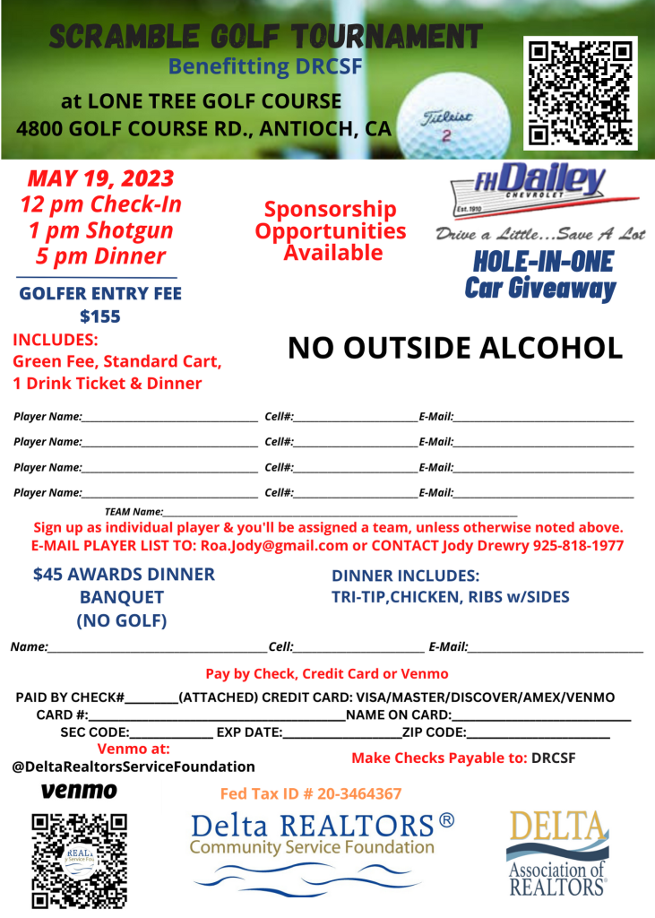Fundraiser benefitting DRCSF (Delta REALTORS® Community Service Foundation). The DRCSF provides monetary and food donations for local programs like Bay Area Community Service, St. Anthony’s Catholic Church, Brentwood Regional Community Chest, Golden Hills, Senior Center,  Elderly Foundation and local Group Homes. In addition to the donations, the DRCSF also provides seven $1,000 scholarships to graduating seniors in each of the local high schools from Brentwood to Pittsburg.