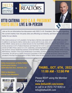 Join us in collaboration with Delta Women’s Council of REALTORS® for an informative live discussion with 2022 C.A.R. President, Otto Catrina regarding the current market, how 3rd party sites are affecting our industry, and how we can advocate better for our clients.