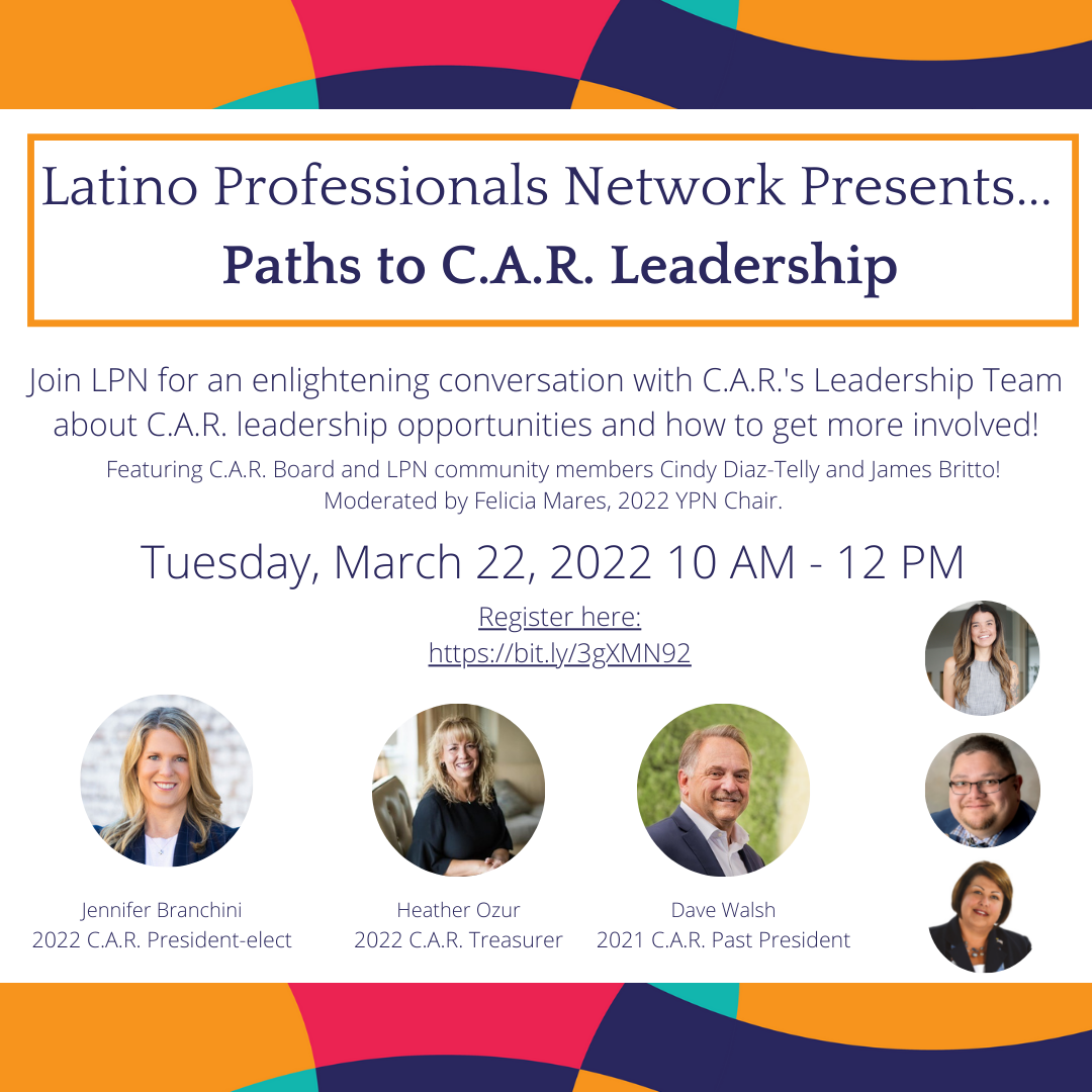 Join Latino Professionals Network for an exciting virtual event with California Association of REALTORS® Leadership Team about C.A.R. leadership opportunities and how to get more involved. You’ll hear all about the process, criteria, and tips for securing leadership roles within C.A.R. from C.A.R. Officers and C.A.R. leaders from the LPN community.