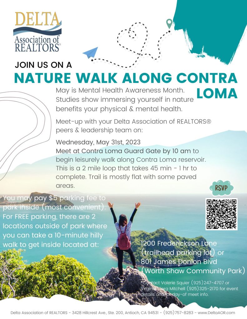 May is Mental Health Awareness Month. Studies show immersing yourself in nature benefits your physical & mental health. Join us on a nature walk along Contra Loma.